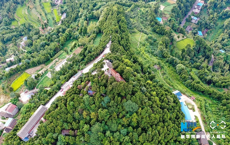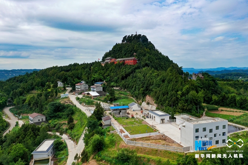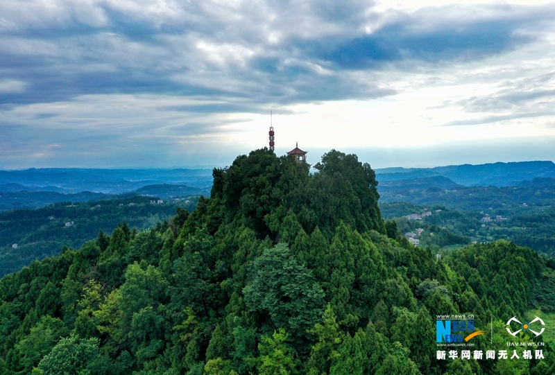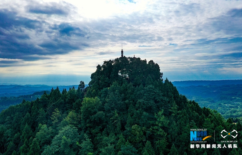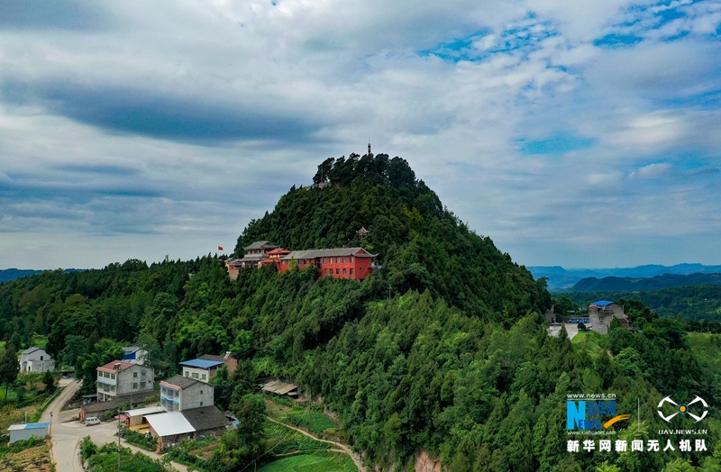 图为2021年8月17日,孤峰独立、郁郁葱葱、可观四县区的四川省南充市仪陇县八大景观之一的立山寨(无人机照片)。新华网发(邱海鹰 摄)